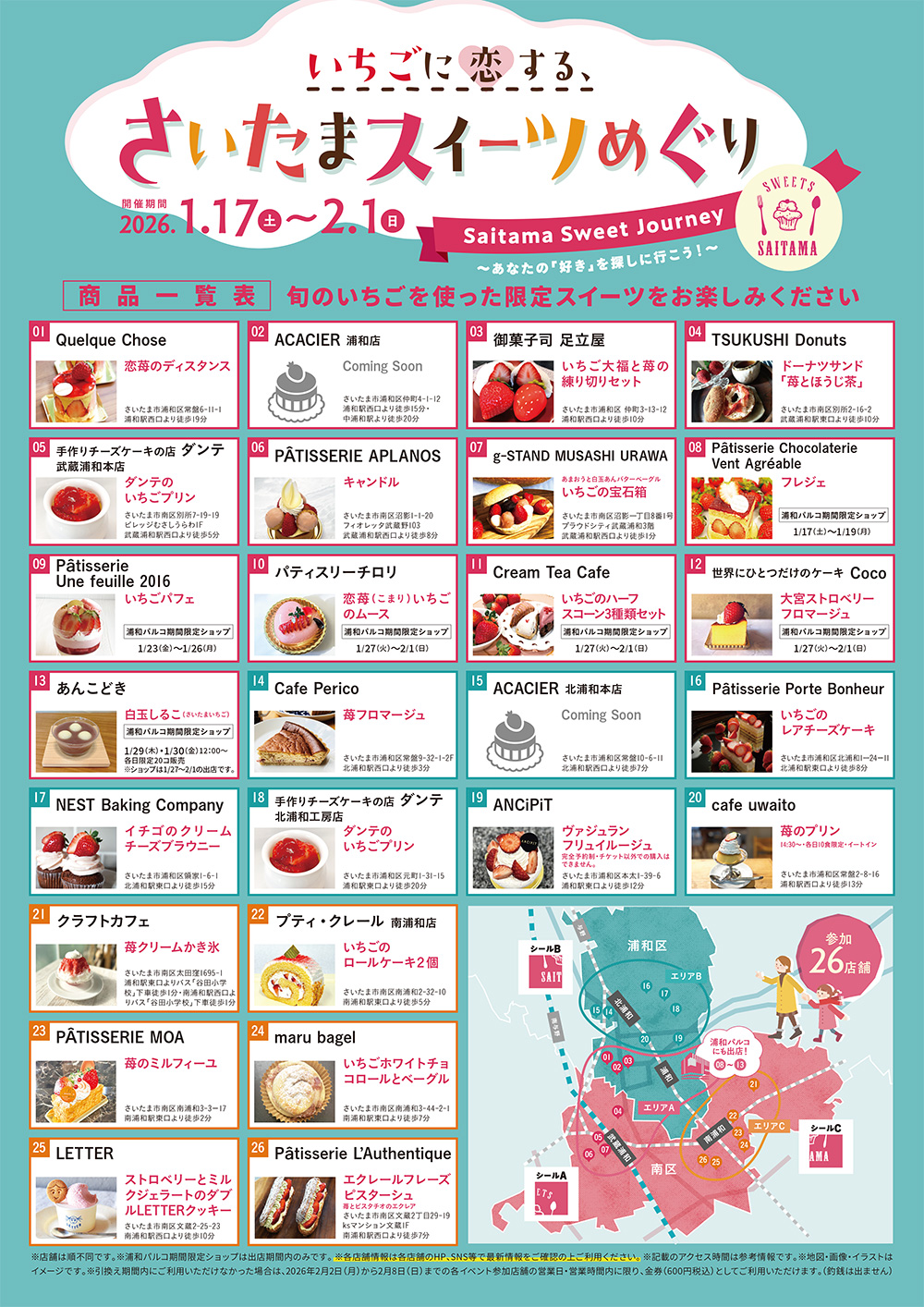 同イベントは、さいたま市が市内のスイーツ全体の消費拡大による地域経済活性化を目的として行っているPR活動「さいたまスイーツ」の一環として、浦和区と南区にあるスイーツ店20店舗と浦和パルコ期間限定出店6店舗をめぐり、事前購入したチケットと引き換えに期間限定のいちごスイーツが味わえるというもの。
