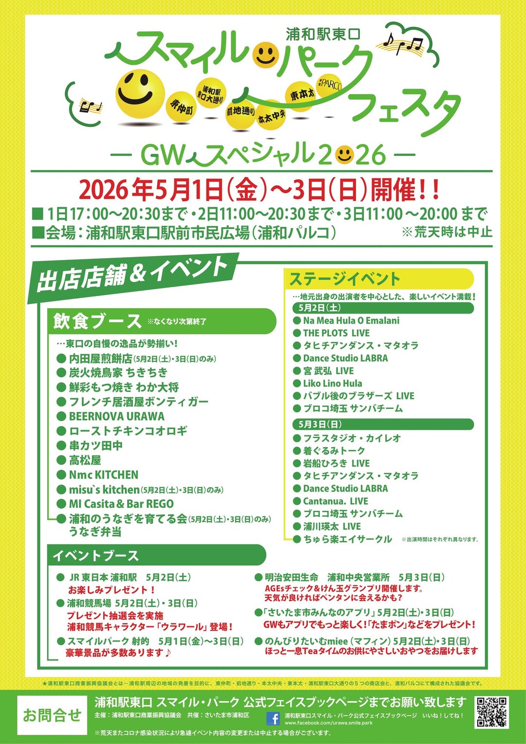 浦和駅東口駅前市民広場(浦和パルコ前)にて飲食店の出店やステージイベントなどが行われる恒例のイベント「スマイルパークフェスタ GWスペシャル2026」が、2026年5月1日(金)〜3日(日)まで開催されます。